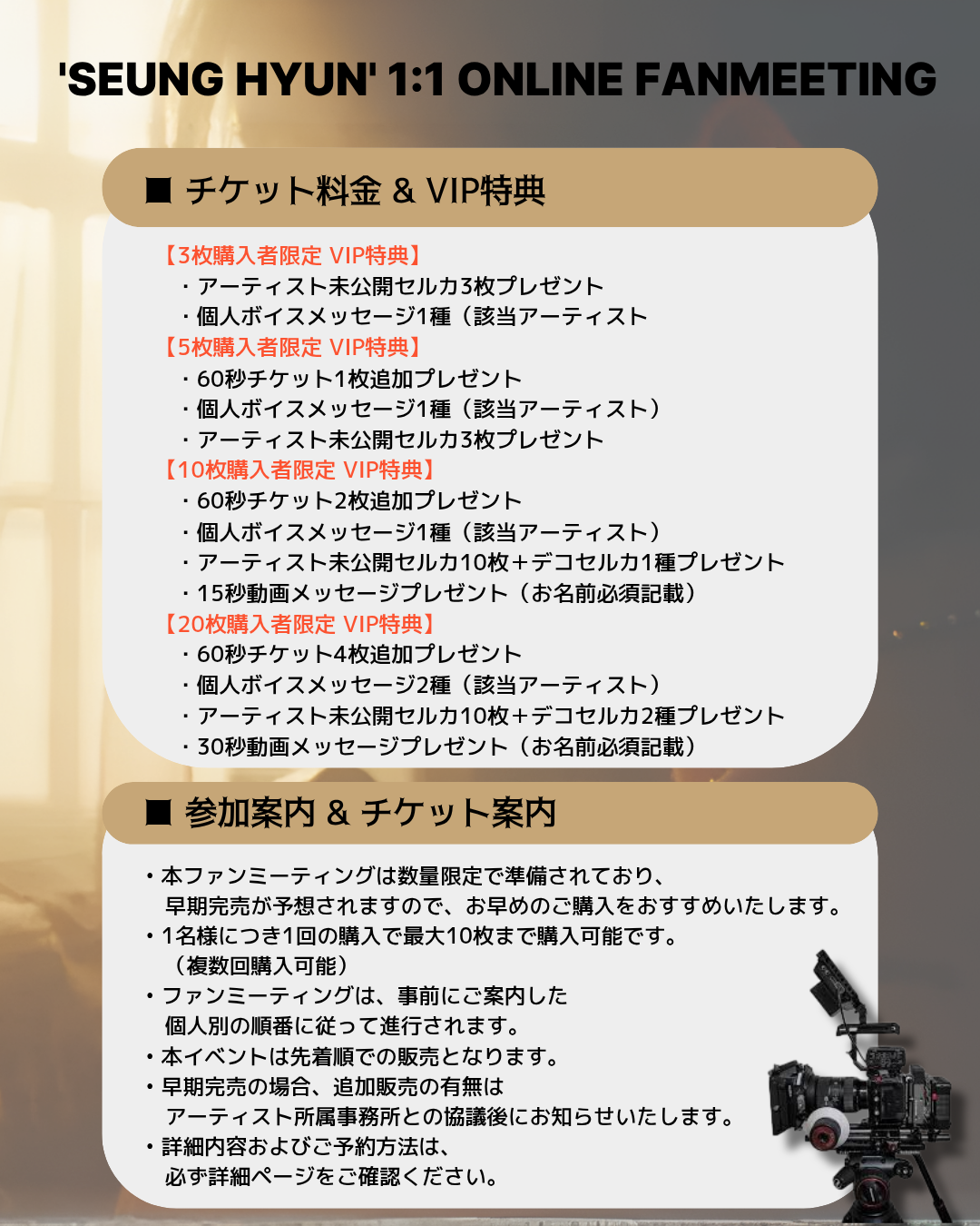 - 本ファンミーティングは数量限定で準備されており、早期完売が予想されますので、お早めのご購入をおすすめいたします。