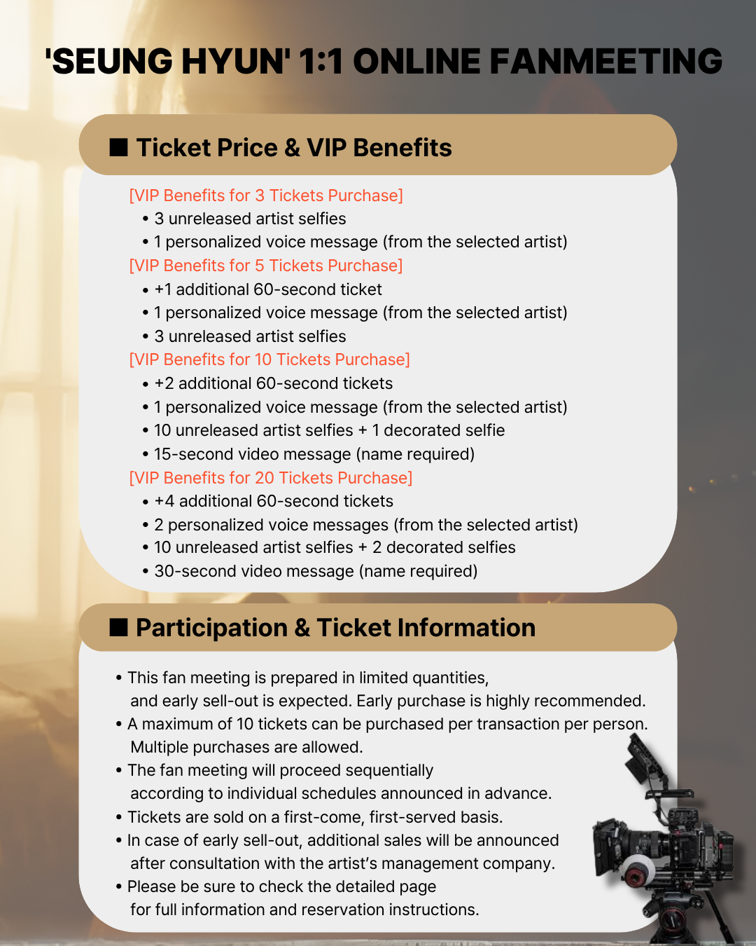 - Each ticket equals 60 seconds of a 1:1 online fan meeting.